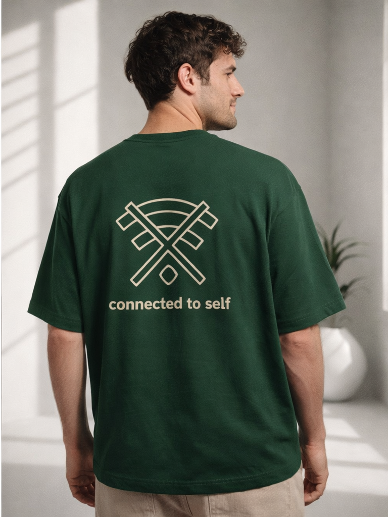 Minimal from the front, meaningful from the back. The front features a clean “no signal” text, while the back reveals a bold graphic with the message “connected to self”—a statement of disconnecting from noise and reconnecting with yourself. Crafted from premium soft cotton in a relaxed oversized fit, this tee blends modern streetwear with deep, conscious design.